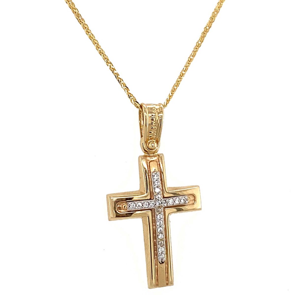 Σταυρός βάπτισης για κορίτσι από δίχρωμο χρυσό 14Κ με πέτρες ζιργκον.