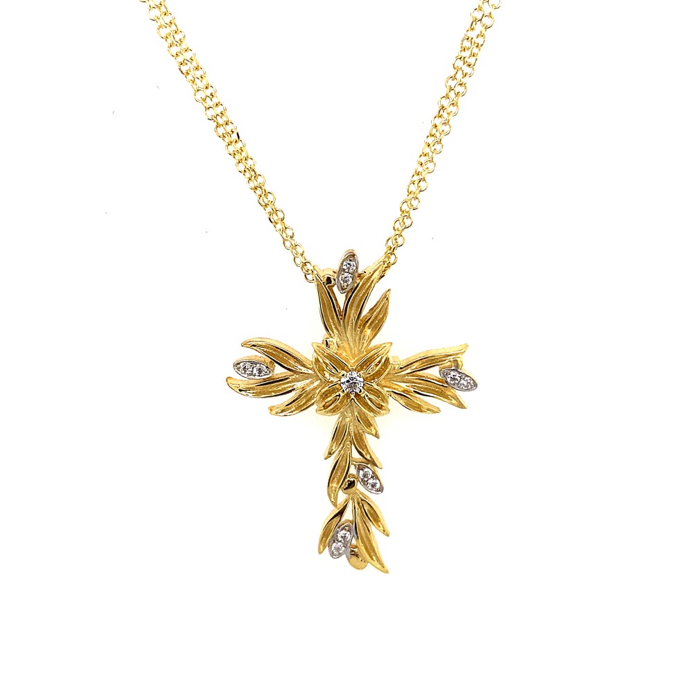 Χειροποίητος χρυσός σταυρός κ14, σχεδιασμένο από φύλλα με πέτρες ζιργκόν με ιδιαίτερο σχέδιασμό και φινίρισμα.