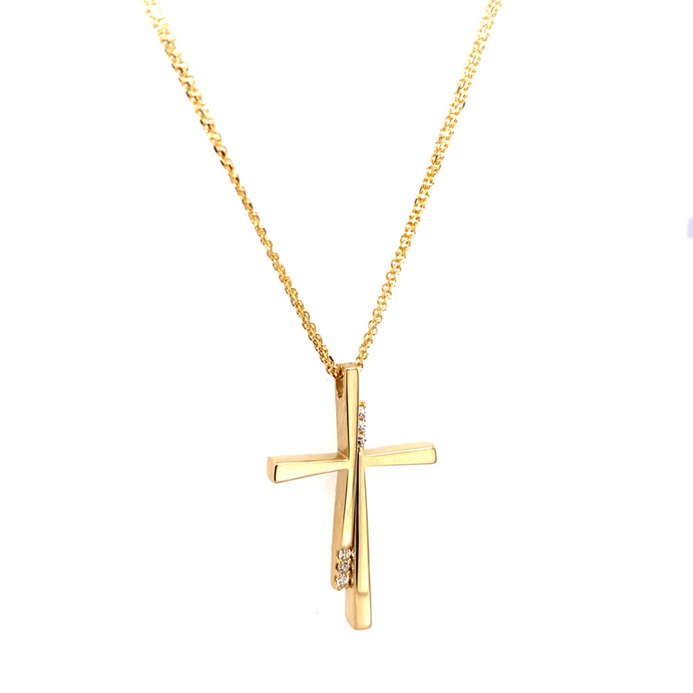 Χρυσός σταυρός κ14 με λουστρέ επιφάνεια και πέτρα ζιργκόν στις άκρες του σταυρού. Λεπτοκαμωμένο φινίρισμα. Τιμή με αλυσίδα η οποία είναι διπλή.