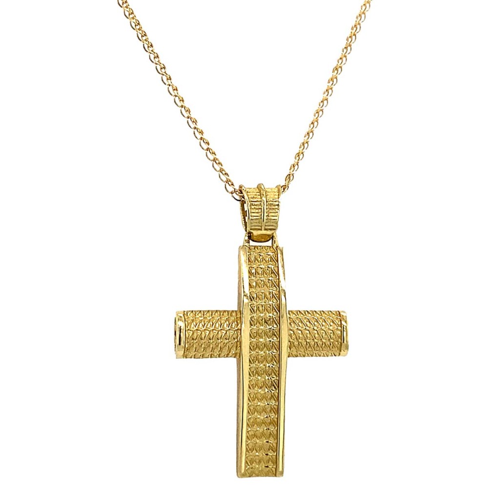 Σταυρός βάπτισης για κορίτσι από χρυσό 14Κ πλεκτό σχέδιο με λουστρέ επιφάνεια.