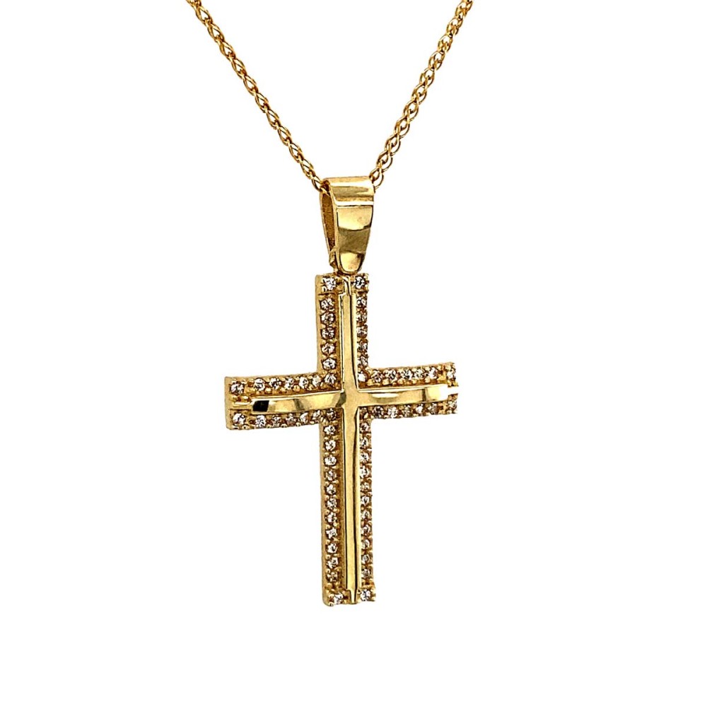 Σταυρός βάπτισης για κορίτσι από χρυσό 14Κ με λοξές επιφάνειες στις άκρες και λευκές πέτρες ζιργκόν περιμετρικά.