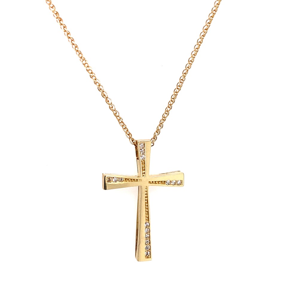 Γυναικείος σταυρός από κίτρινο χρυσό 14κ με λευκά ζιργκόν.
