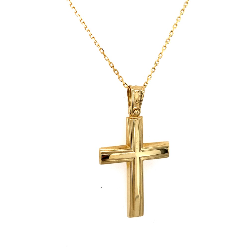 Σταυρός βάπτισης από χρυσό 14Κ σε σατινέ επιφάνεια με λουστρέ λεπτομέρειες.
