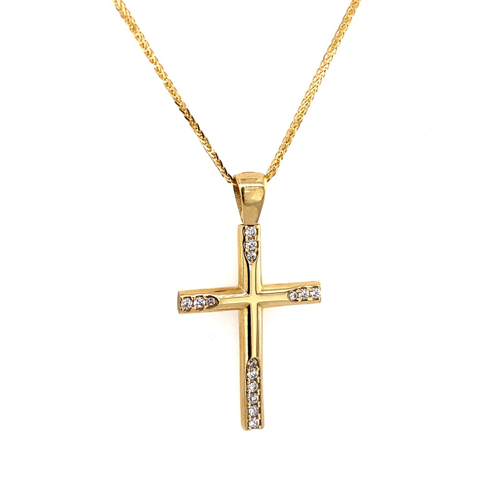 Λεπτοκαμωμένος σταυρός από κίτρινο χρυσό 14 καρατίων με λουστρέ επιφάνεια και ζιργκόν.