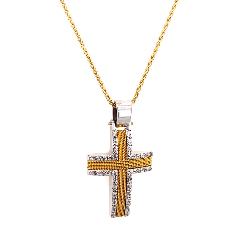 Χρυσός σταυρός πλεκτός σε κίτρινο και λευκό χρυσό σε 18Κ, με 22 πέτρες μπριγιάν.
