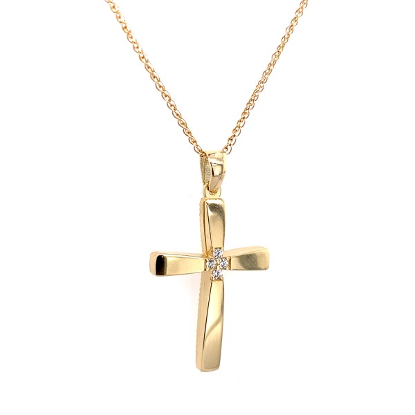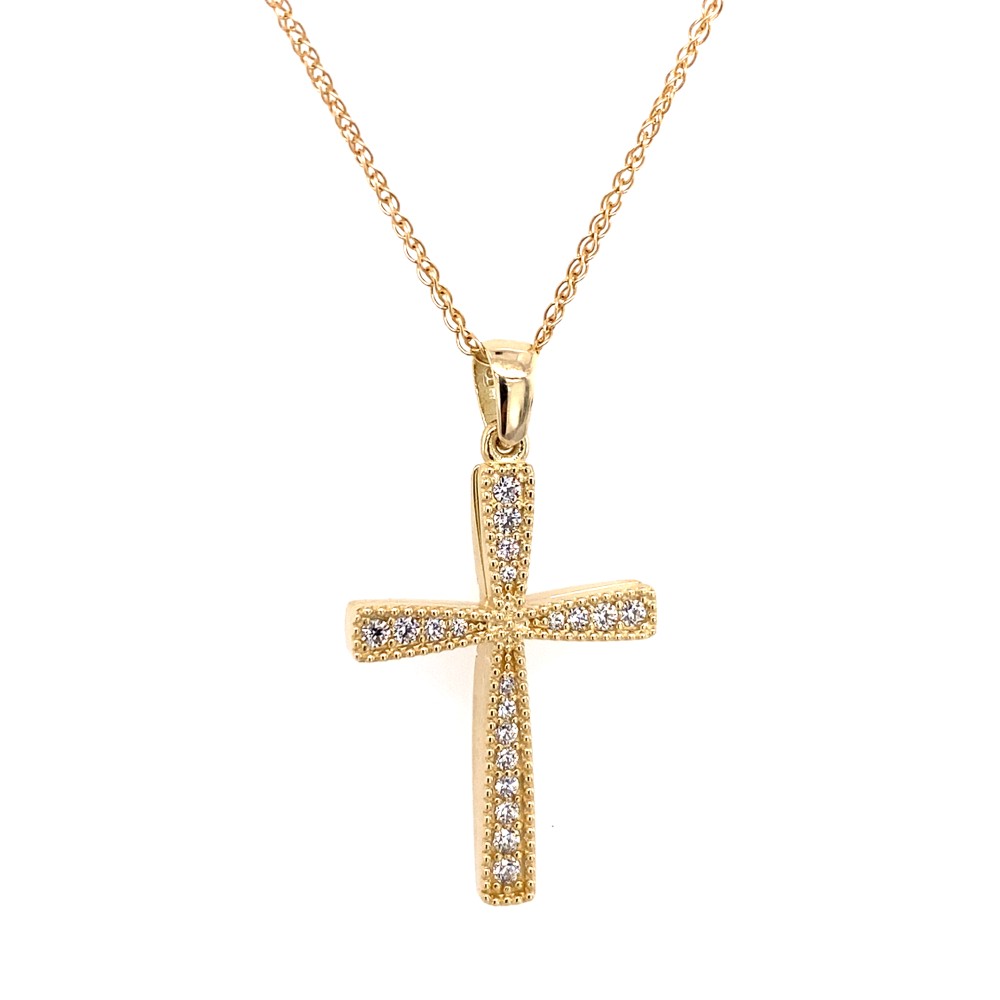 Γυναικείος σταυρός από κίτρινο χρυσό 14κ με λευκά ζιργκόν, διπλής όψης.