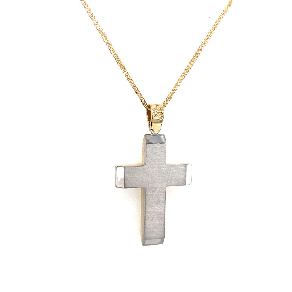 Σταυρός βάπτισης για αγόρι από χρυσό 14Κ με ματ χρυσή επιφ΄ανεια από τη μια πλευρά και λευκή ματ επιφάνεια από την άλλη. Σταύρος διπλής όψης.