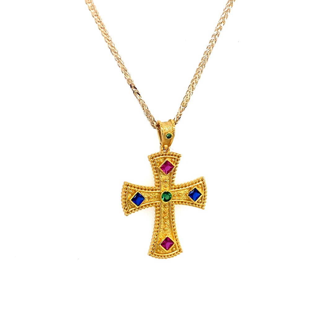 Γυναικείος σταυρός από χρυσό 14 καρατίων, σε βυζαντινό σχεδιασμό και με ματ ανάγλυφη επεξεργασία, στολισμένος με πολύχρωμες πέτρες ζιργκόν.