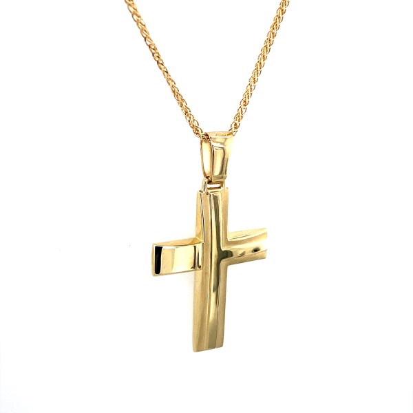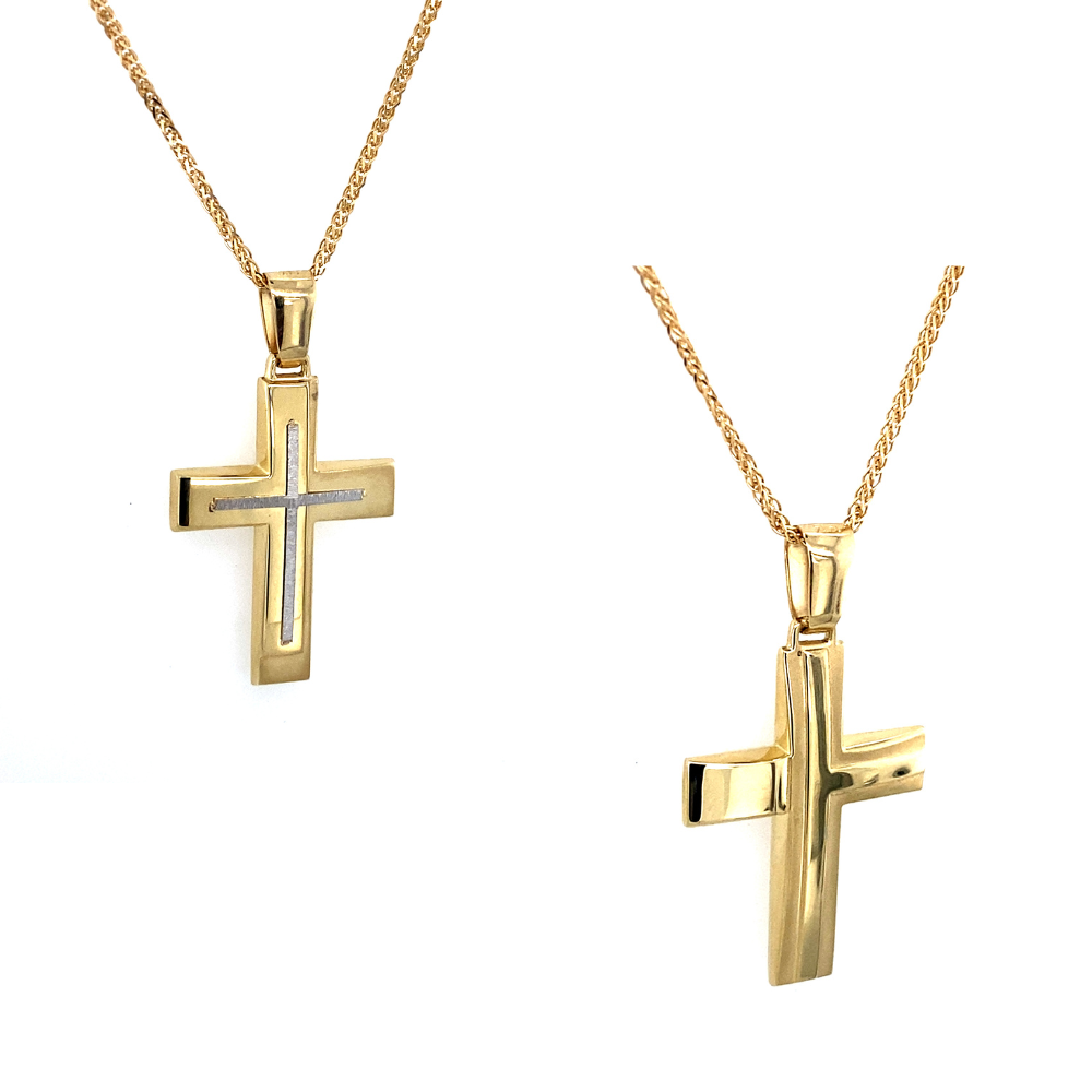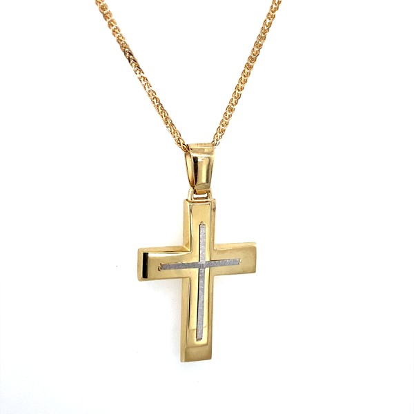 Σταυρός βάπτισης για αγόρι από χρυσό 14Κ δίχρωμο με λουστρέ και ματ επιφάνεια στο εσωτερικό. Σταυρός διπλής όψης. Τιμή χωρίς αλυσίδα.