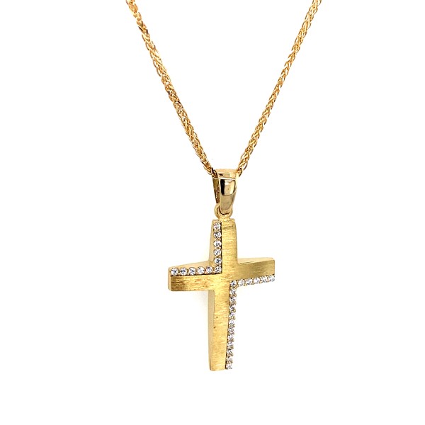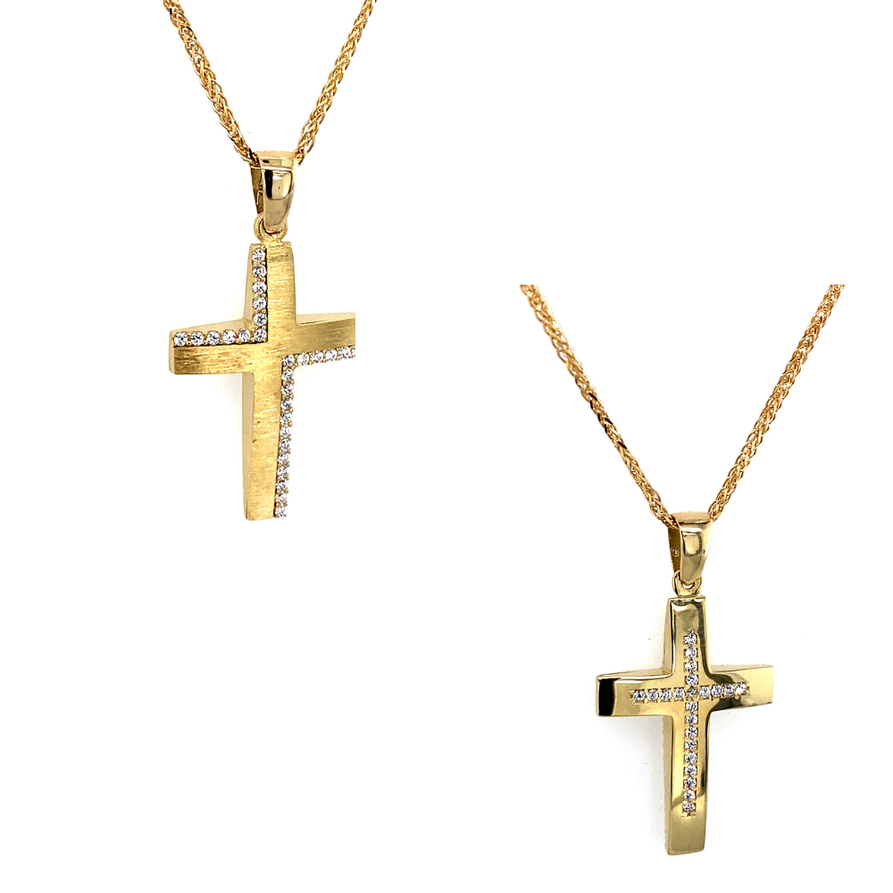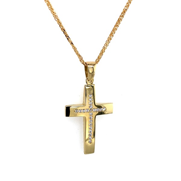 Σταυρός βάπτισης για κορίτσι από κίτρινο χρυσό με πέτρες ζιργκόν 14Κ διπλής όψεως.