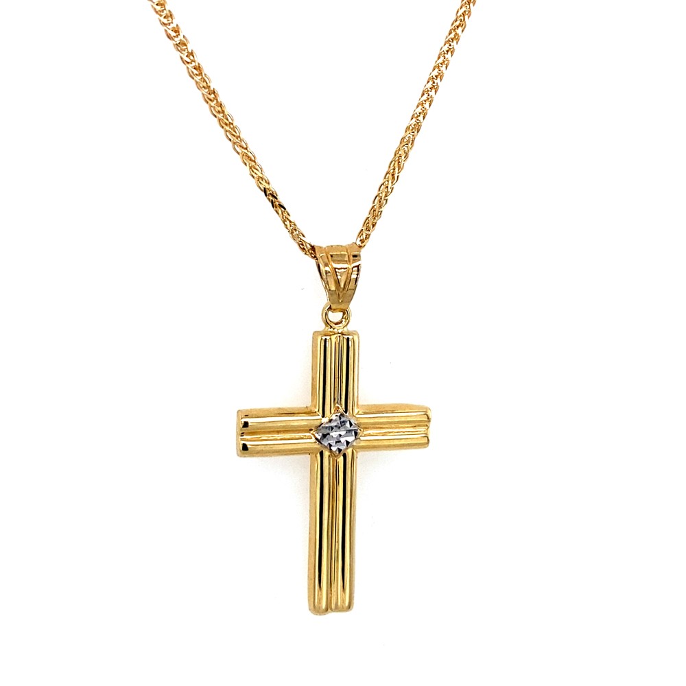 Χρυσός σταυρός σε 14 καράτια σε γυαλιστερό φινίρισμα που μπορεί να φορεθεί και από αγόρι και από κορίτσι.