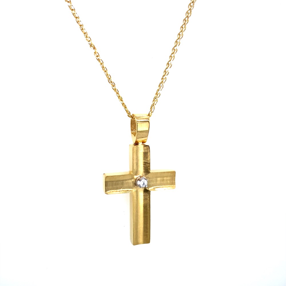 Βαπτιστικός Σταυρός σε χρυσό 18Κ με ματ επιφάνεια και πέτρα μπριγιάν στο κέντρο.