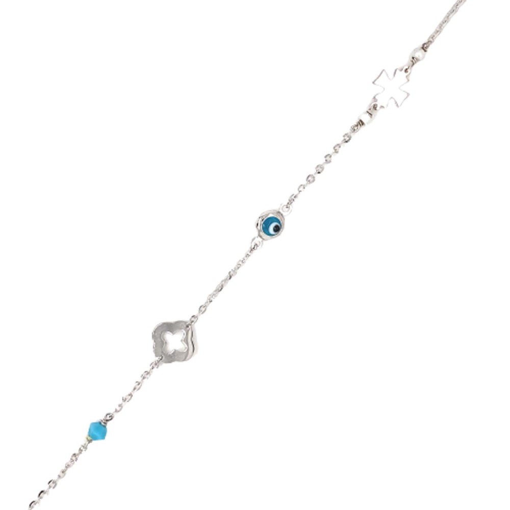 Γυναικείο βραχιόλι από λευκόχρυσο 14Κ με στοιχεία, ματάκι-σταυρουδάκι και πέτρα τιρκουάζ.