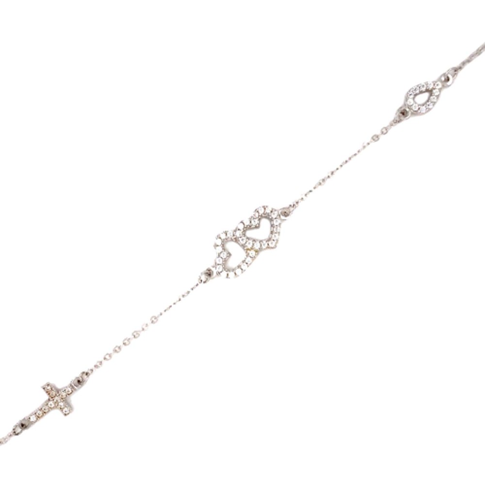 Γυναικείο βραχιόλι από λευκόχρυσο 14Κ με στοιχεία καρδιές, Σταυρουδάκι και σταγόνα με λευκές πέτρες ζιργκόν.