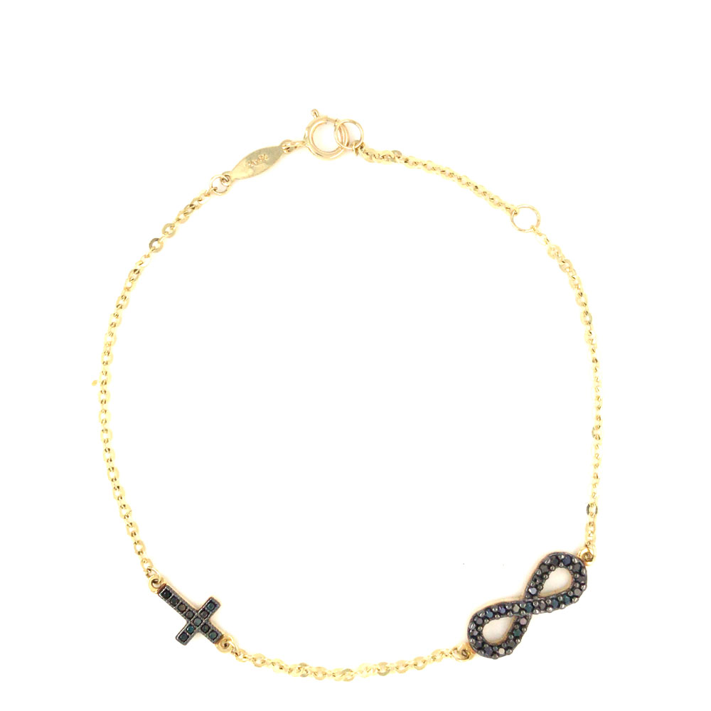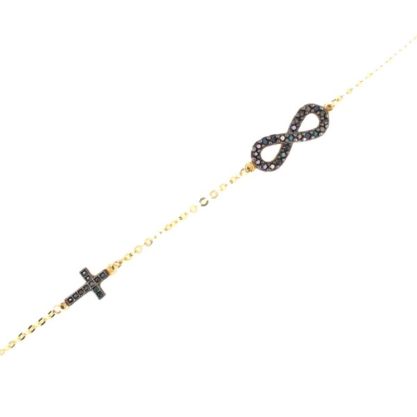Γυναικείο Βραχιόλι από Χρυσό 9Κ με σχέδιο το άπειρο, διακοσμημένο με μαύρες πέτρες Ζιργκόν και Σταυρουάκι.