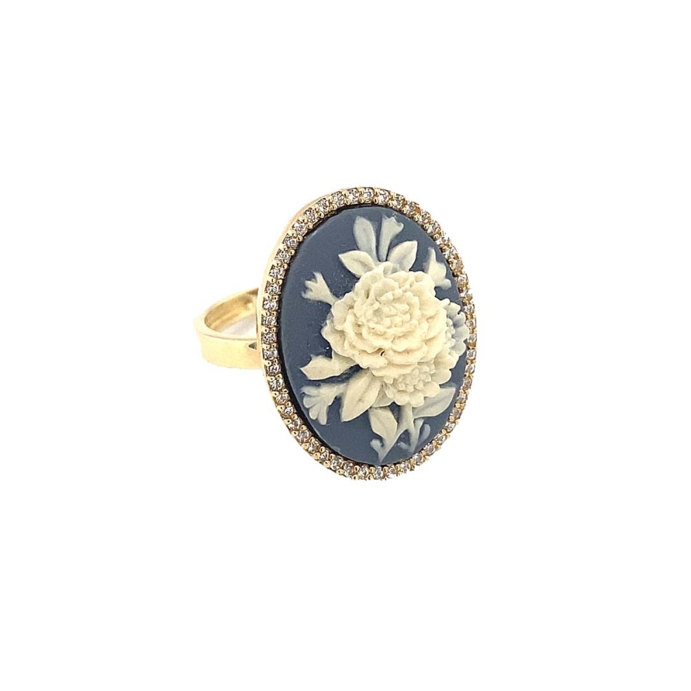 Δαχτυλίδι χειροποίητο από χρυσό 14Κ με πέτρα Cameo resin gray και λευκά ζιργκόν περιμετρικά.