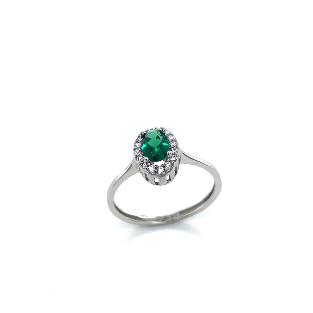 Γυναικείο δαχτυλίδι από λευκόχρυσο 14Κ, σχέδιο ροζέτα σε οβάλ σχήμα με πράσινη πέτρα ζιργκόν στο κέντρο και λευκά περιμετρικά.