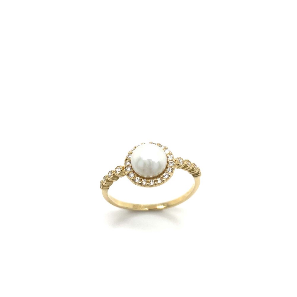 Δαχτυλίδι ροζέτα με μαργαριτάρι από χρυσό 14Κ και λευκά ζιργκόν περιμετρικά.