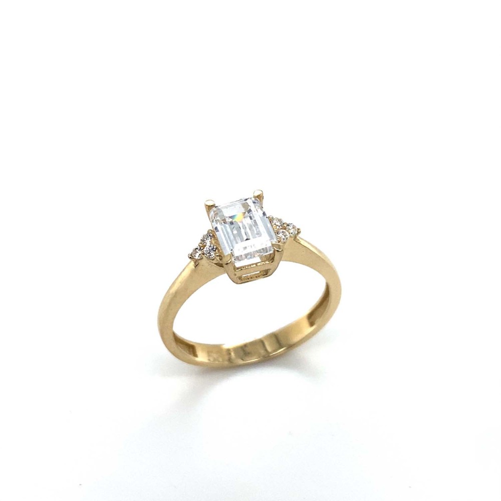 Γυναικείο δαχτυλίδι από χρυσό 14Κ με ένα baguette ζιργκόν σε λευκό χρώμα στο κέντρο και μικρότερα λευκά στο πλάι.