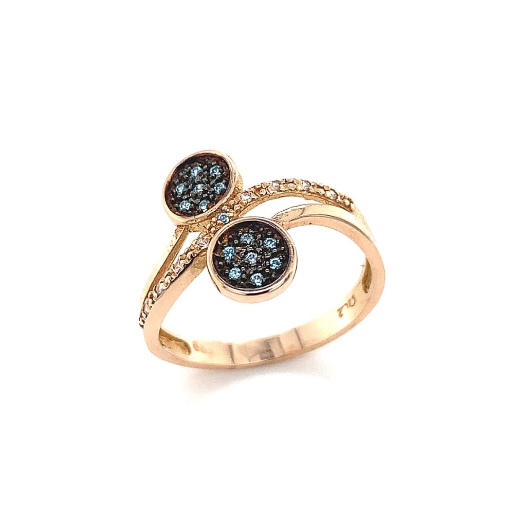 Δαχτυλίδι από χρυσό 14Κ χρώματος ρόζ με λευκά και μπλέ ζιργκόν.