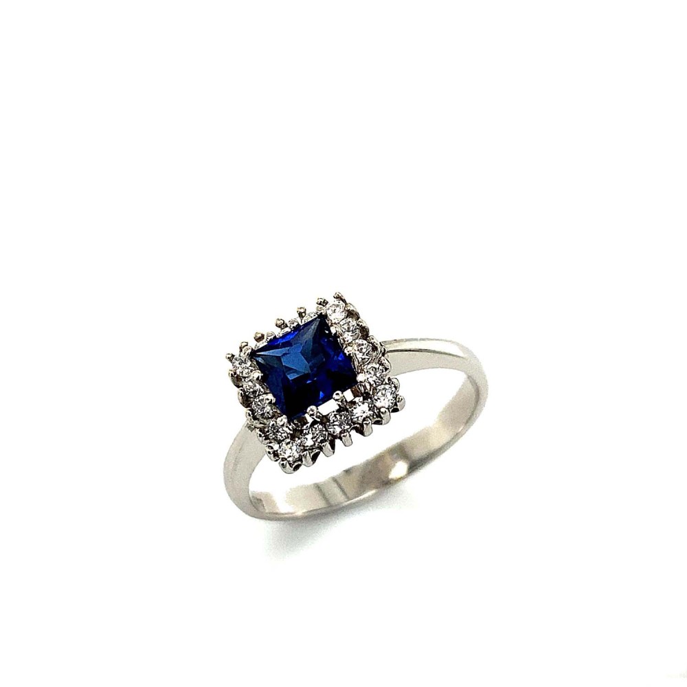 Δαχτυλίδι ροζέτα από λευκόχρυσο 14Κ με μπλε πέτρα ζιργκόν.