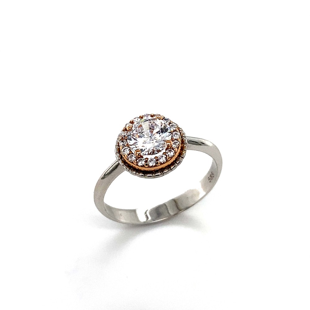 Δαχτυλίδι από λευκό και ροζ χρυσό 14Κ, διακοσμημένο με λευκές πέτρες ζιργκόν. Εντυπωσιακό σχέδιο για κάθε περίσταση.