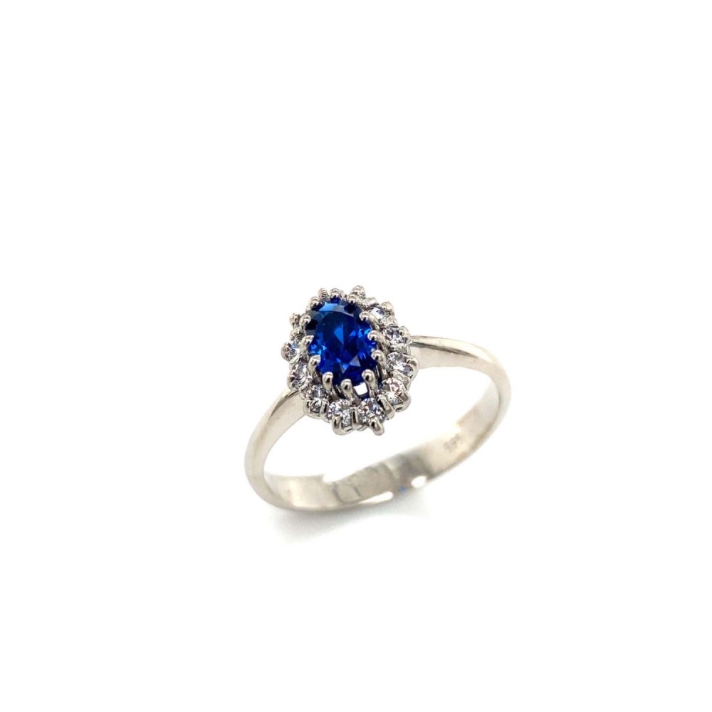 Δαχτυλίδι ροζέτα από λευκόχρυσο 14Κ με μπλέ πέτρα.