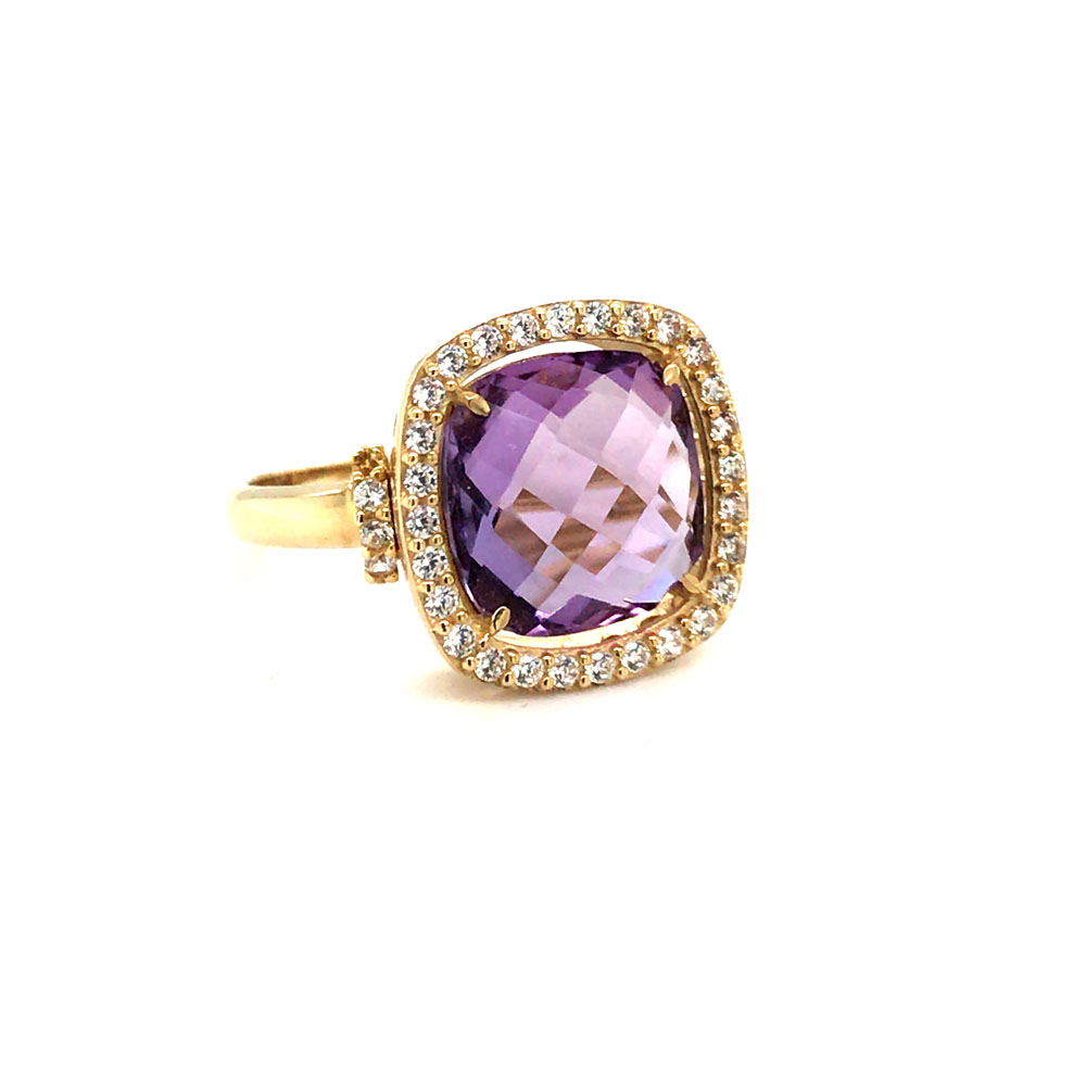 Δαχτυλίδι από χρυσό 14Κ με μώβ και λευκές πέτρες ζιργκόν.