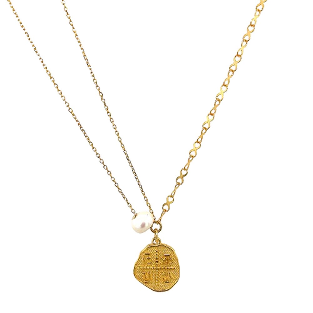 Γυναικείο κολιέ Κωνσταντινάτο με μαργαριτάρι από χρυσό 14Κ με διπλή αλυσίδα απο τη μια και μονή από την άλλη.