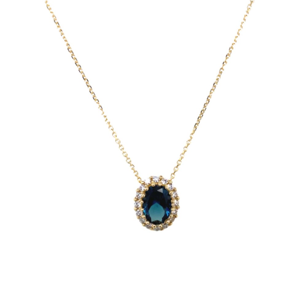 Γυναικείο κολιέ ροζέτα από χρυσό 14Κ με εντυπωσιακή οβάλ πέτρα London Blue στο κέντρο και λευκά ζιργκόν περιμετρικά.