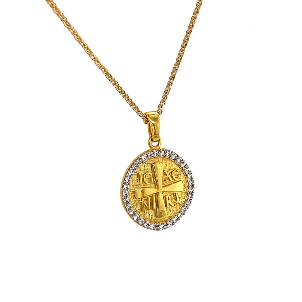 Κωνσταντινάτο μενταγιόν από χρυσό 9Κ με λευκά ζιργκόν περιμετρικά.
