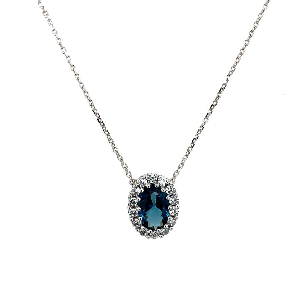 Μενταγιόν γυναικείο σε λευκόχρυσο 14Κ με ημιπολύτιμη πέτρα London blue και λευκά ζιργκόν περιμετρικά. Συνδιάστε το με τα σκουλαρίκια της ίδιας σειράς για να εντυπωσιάσετε.