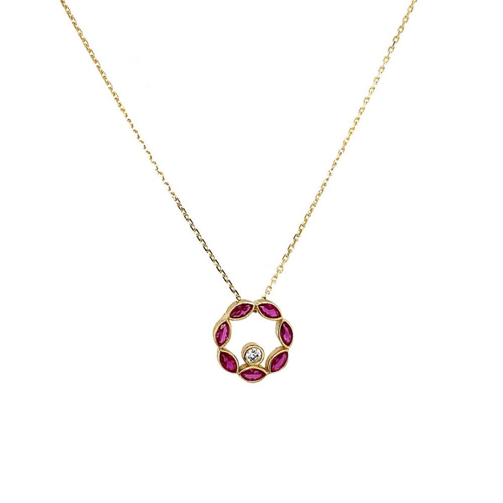 Μενταγιόν γυναικείο από χρυσό 14Κ με κρεμαστό στρογγυλό στοιχείο με ροζ και και λευκό κρύσταλλο ζιργκόν.