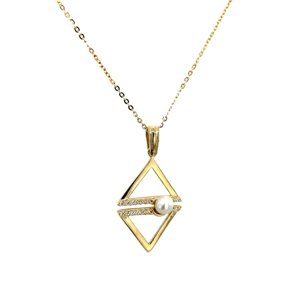 Μενταγιόν γυναικείο σε χρυσό 14Κ, σχέδιο τρίγωνο με φυσικό μαργαριτάρι και λευκές πέτρες ζιργκόν.