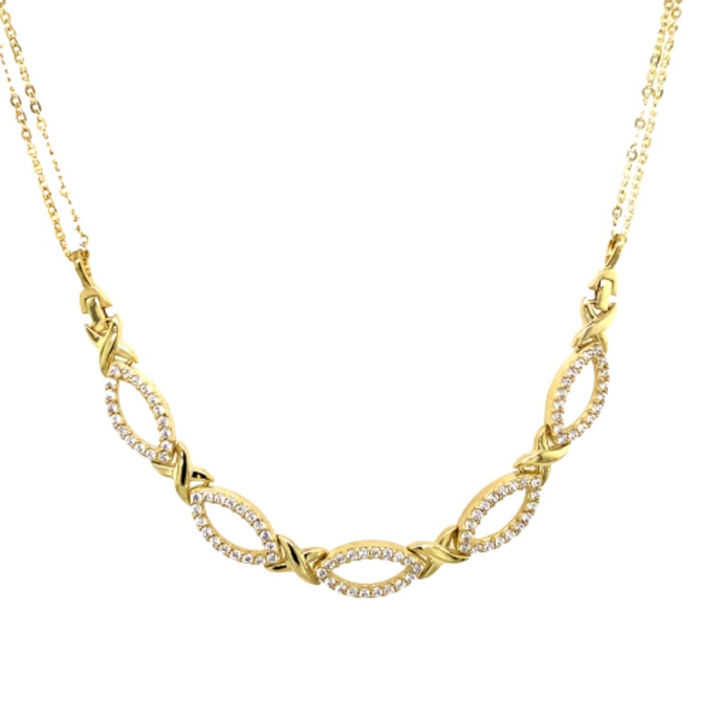Εντυπωσιακό γυναικείο μενταγιόν από χρυσό 14Κ με διπλή αλυσίδα και λευκά ζιργκόν, ιδανικό για να εντυπωσιάσετε. Συνδυάστε το με το βραχιόλι της ίδιας σειράς για μια ολοκληρωμένη εμφάνιση.