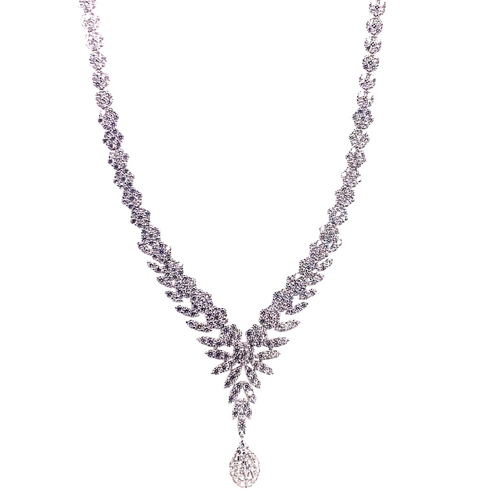 Περιδέραιο λαιμού για γάμο σε λευκόχρυσο χρώμα διακοσμημένο με λευκές πέτρες ζιργκόν. Συνδυάζεται με βραχιόλι σκουλαρίκι και δαχτυλίδι. Χρυσός 14 καρατίων.
