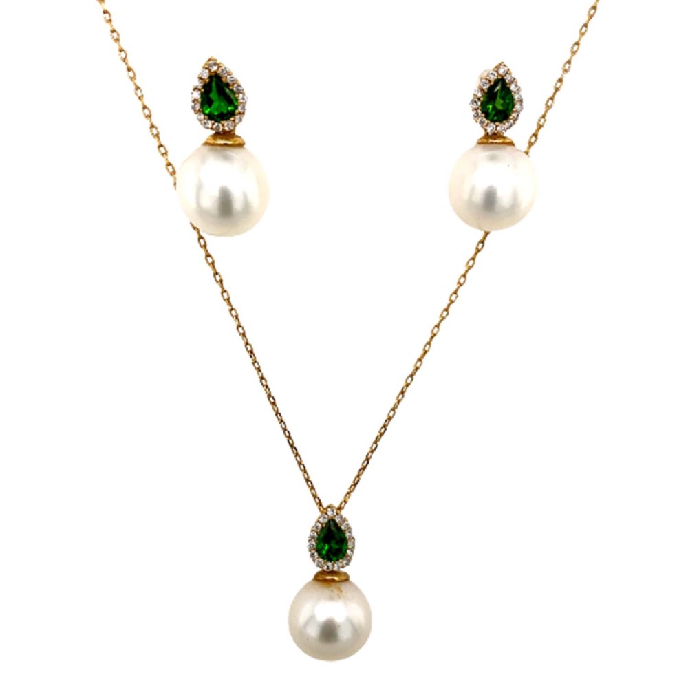 Σετ δυο τεμαχίων σκουλαρίκια-μενταγιόν από χρυσό 18Κ με φυσικά μαργαριτάρια, σμαράγδια και διαμάντια 0,04ct(μενταγιόν) και διαμάντια 0,07ct(σκουλαρίκια).