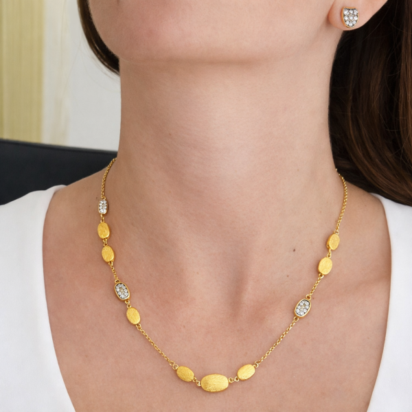 Εντυπωσιακό χειροποίητο σετ σε κίτρινο χρυσό 14Κ διακοσμημένο με λευκά ζιργκόν. Το σετ περιλαμβάνει βραχιόλι, σκουλαρίκια και μενταγιόν.