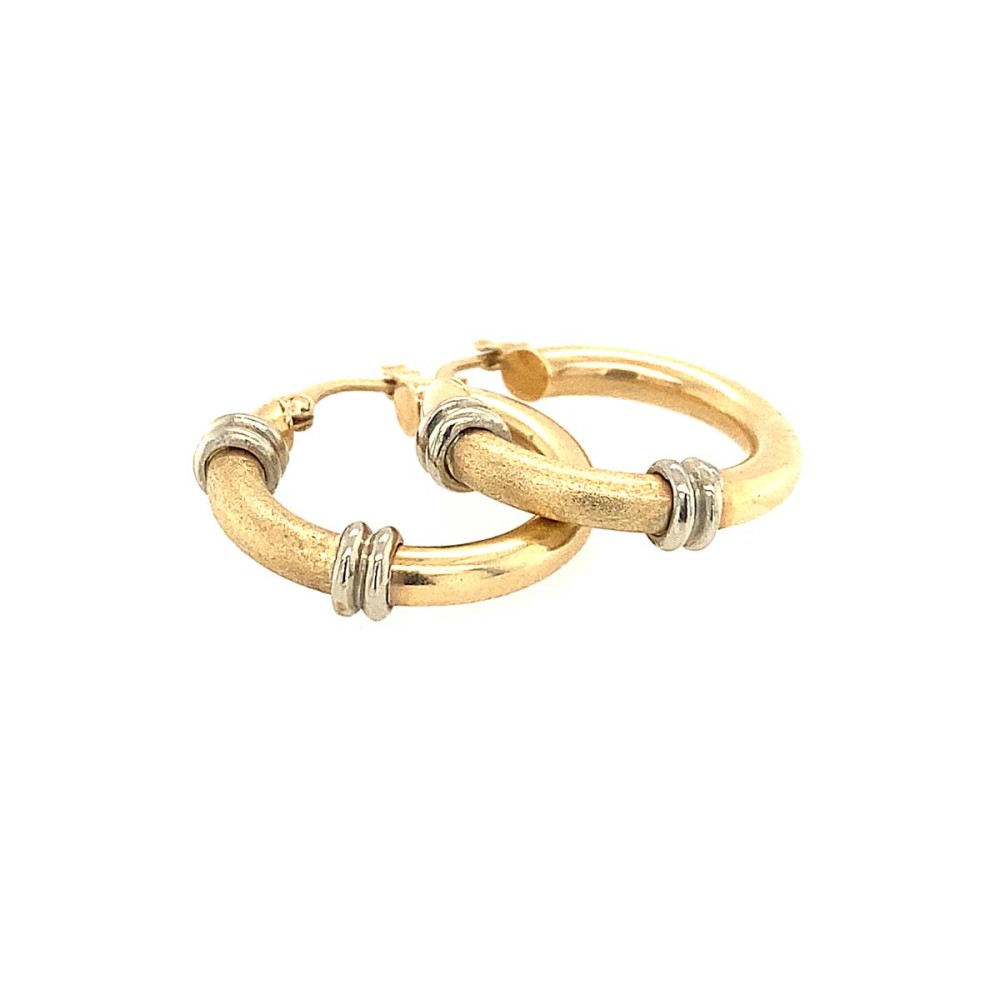 Σκουλαρίκια κρίκοι δίχρωμοι χρυσοί 14Κ λευκό-κίτρινο με επιφάνεια ματ σατινέ-λουστρέ.