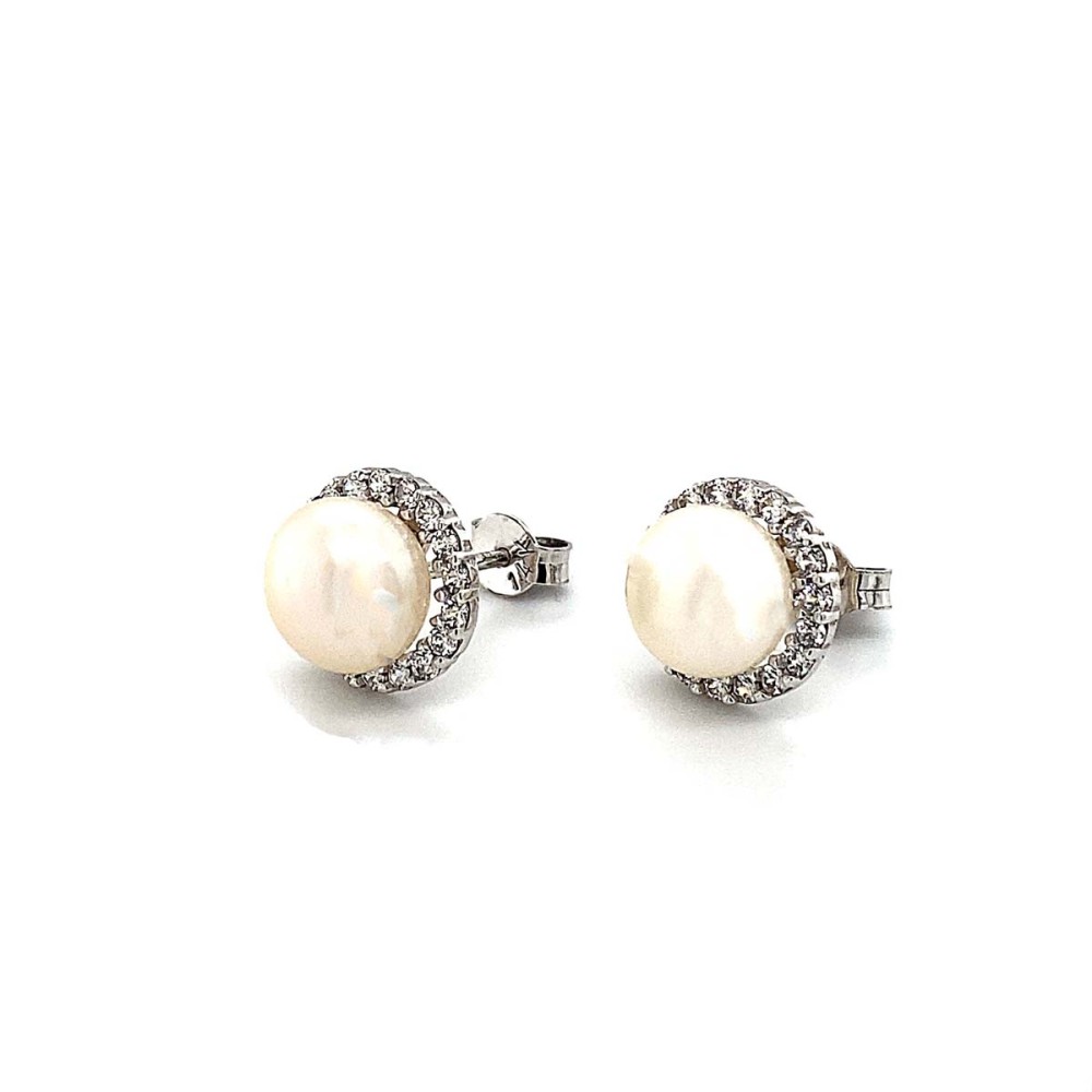 Σκουλαρίκια καρφωτά από λευκό χρυσό 14Κ με μαργαριτάρι και λευκά ζιργκόν περιμετρικά.