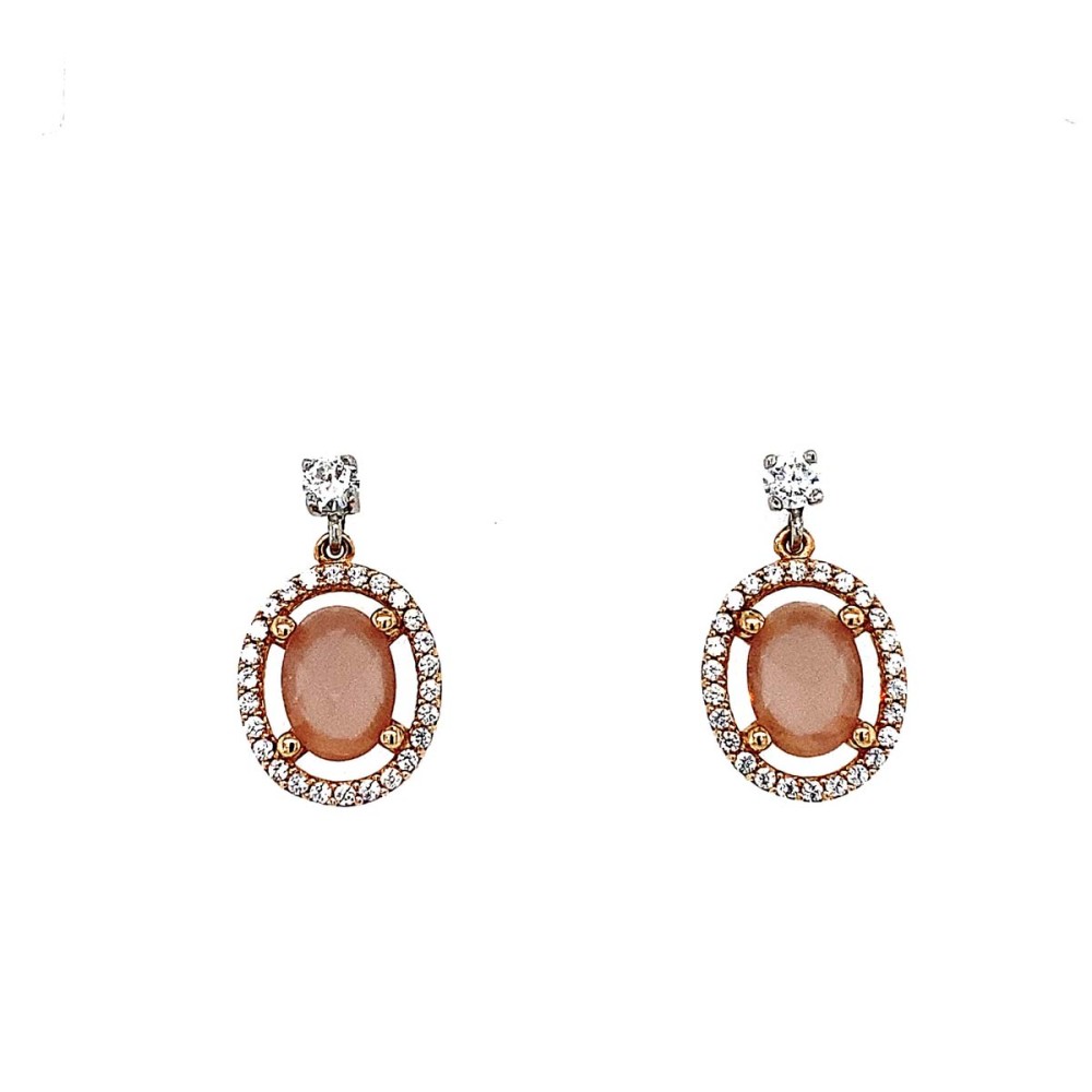 Σκουλαρίκια γυναικεία κρεμαστά από ρόζ χρυσό 14Κ με πέτρα ρόζ quartz και λευκά ζιργκόν περιμετρικά.