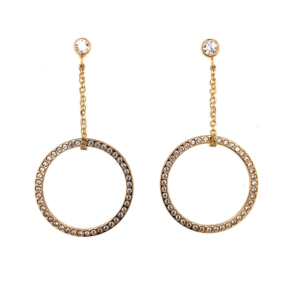 Γυναικεία σκουλαρίκια καρφωτά που κρέμονται από λεπτή αλυσίδα που στο τελείωμα της έχει ένα ένα στοιχείο κύκλου με πέτρες ζιργκόν από χρυσό 14 καρατίων.