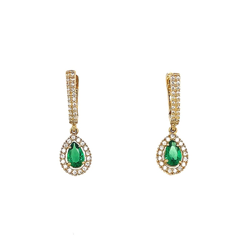 Σκουλαρίκια κρεμαστά από χρυσό 14Κ σχέδιο δάκρυ με πράσινη πέτρα και λευκά ζιργκόν περιμετρικά.