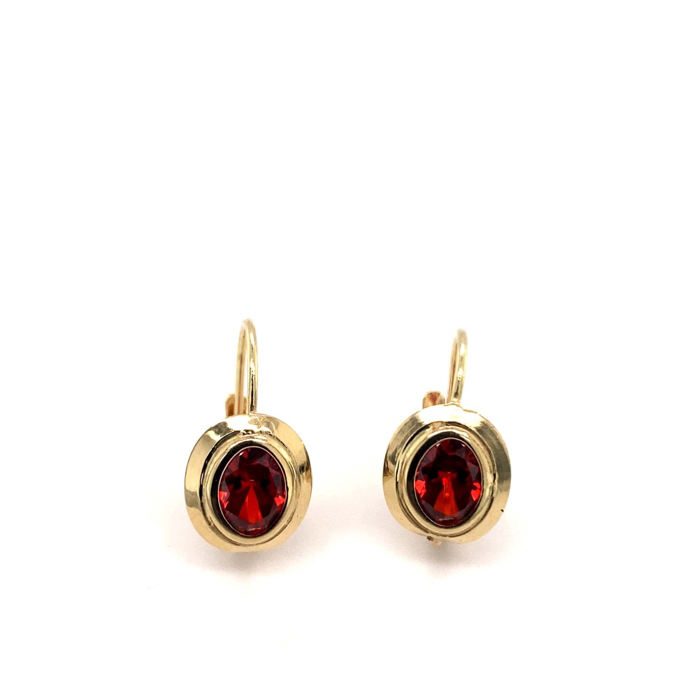 Γυναικεία σκουλαρίκια κρεμαστά από χρυσό 14 καρατίων με οβάλ κόκκινη πέτρα ζιργκόν.