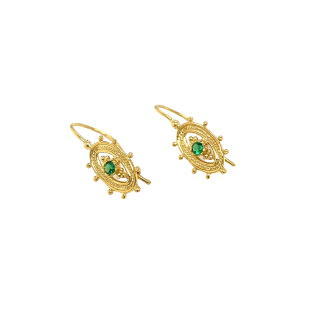 Γυναικεία σκουλαρίκια κρεμαστά χειροποίητα από χρυσό 14Κ με πράσινη πέτρα ζιργκόν στο κέντρο.
