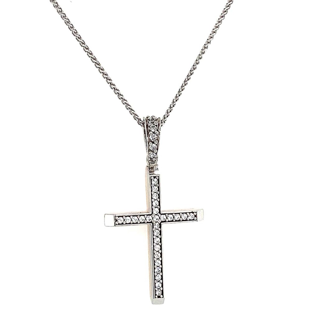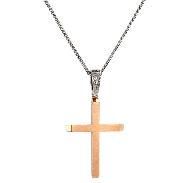 Σταυρός FaCad'Oro γυναικείος διπλής όψης από δίχρωμο χρυσό 14Κ με λουστρέ επιφάνεια και λευκά ζιργκόν.