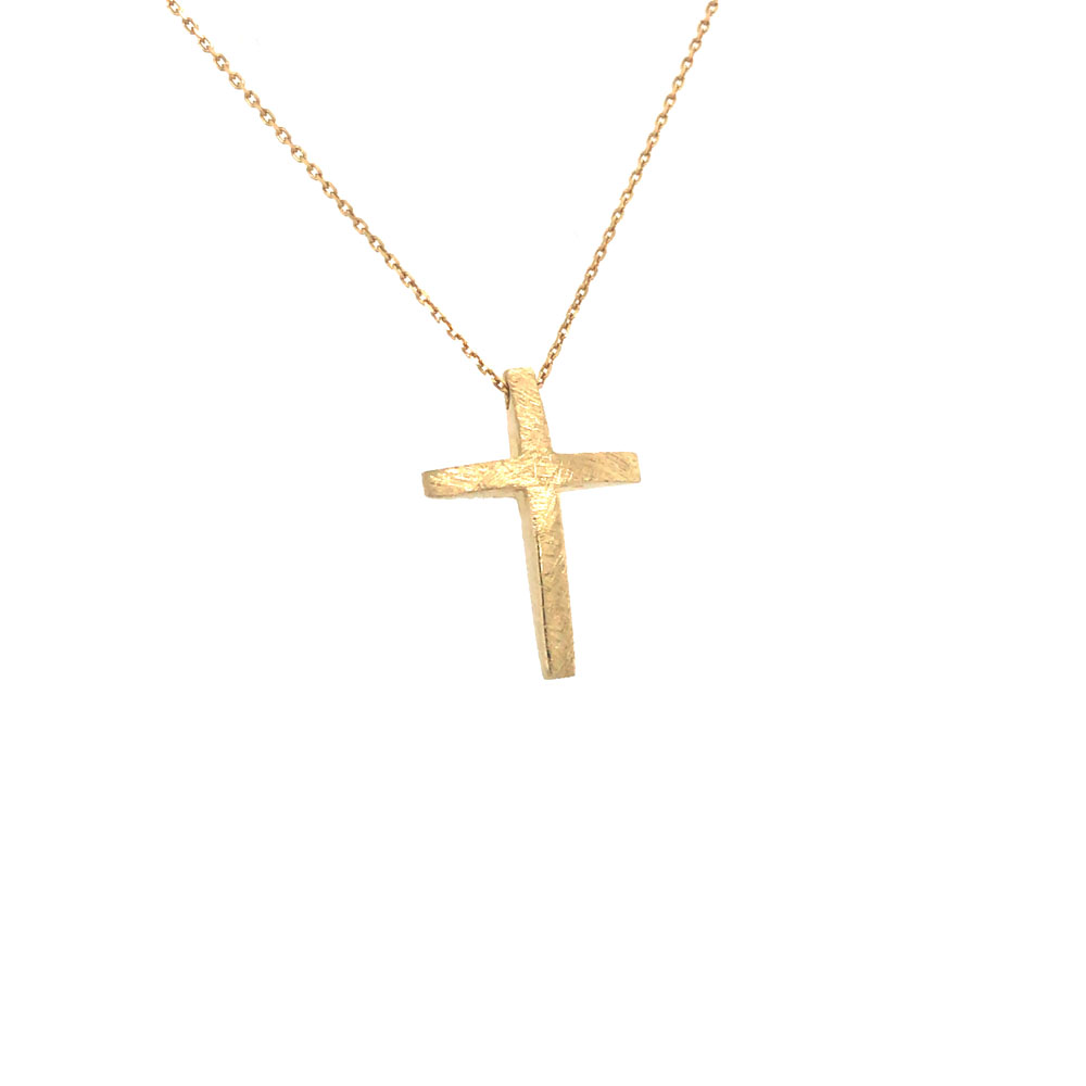 Φύλο: Γυναικείο, Μέταλλο: Χρυσός 14K, Χρώμα: Κίτρινο, Φινίρισμα: Ματ Σατινέ, Βάρος: 2,52gr, Πέτρες: Όχι, Μήκος Αλυσίδας: 40,0cm, Διαστάσεις Σταυρού: 1,9cm x 1,3cm.