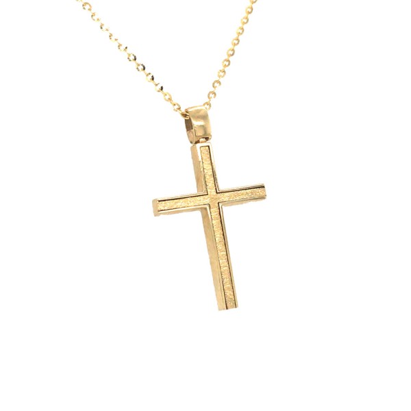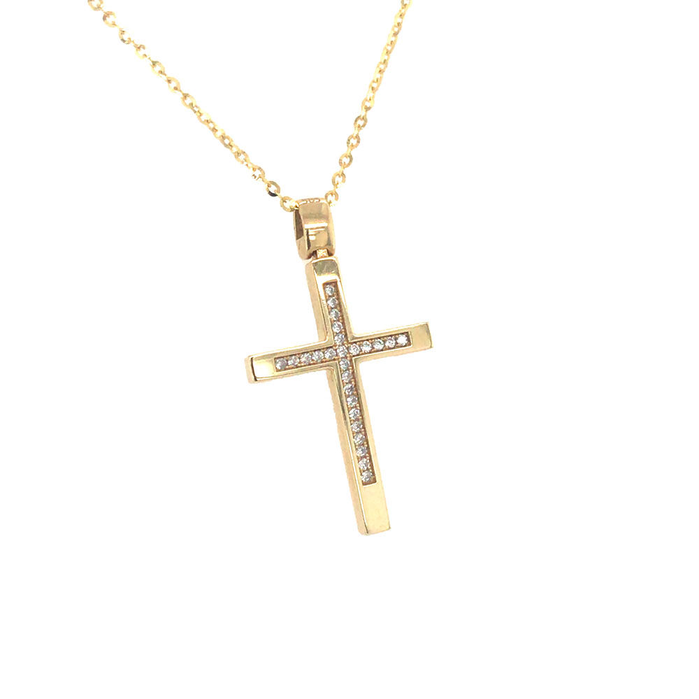 Φύλο: Γυναικείο, Μέταλλο: Χρυσός 14K, Χρώμα: Κίτρινο, Φινίρισμα: Ματ Σατινέ-Λουστρέ, Βάρος: 4,0gr, Πέτρες: Ζιργκόν, Μήκος Αλυσίδας: 45,0cm, Διαστάσεις Σταυρού: 3,0cm x 1,8cm.