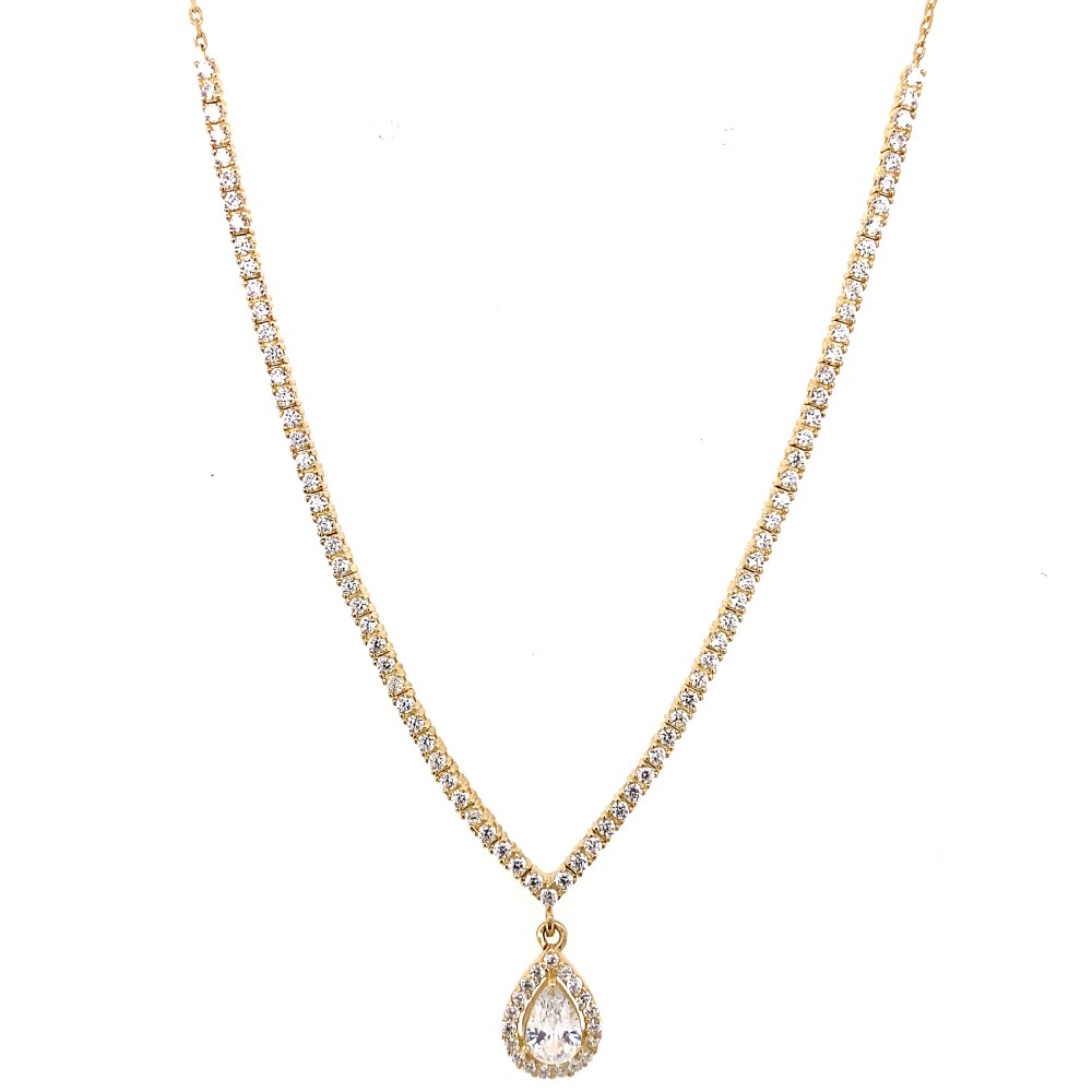 Περιδέραιο λαιμού για γάμο σε χρυσό χρώμα διακοσμημένο με λευκές πέτρες ζιργκόν. Συνδυάζεται με βραχιόλι σκουλαρίκι και δαχτυλίδι. Χρυσός 14 καρατίων.