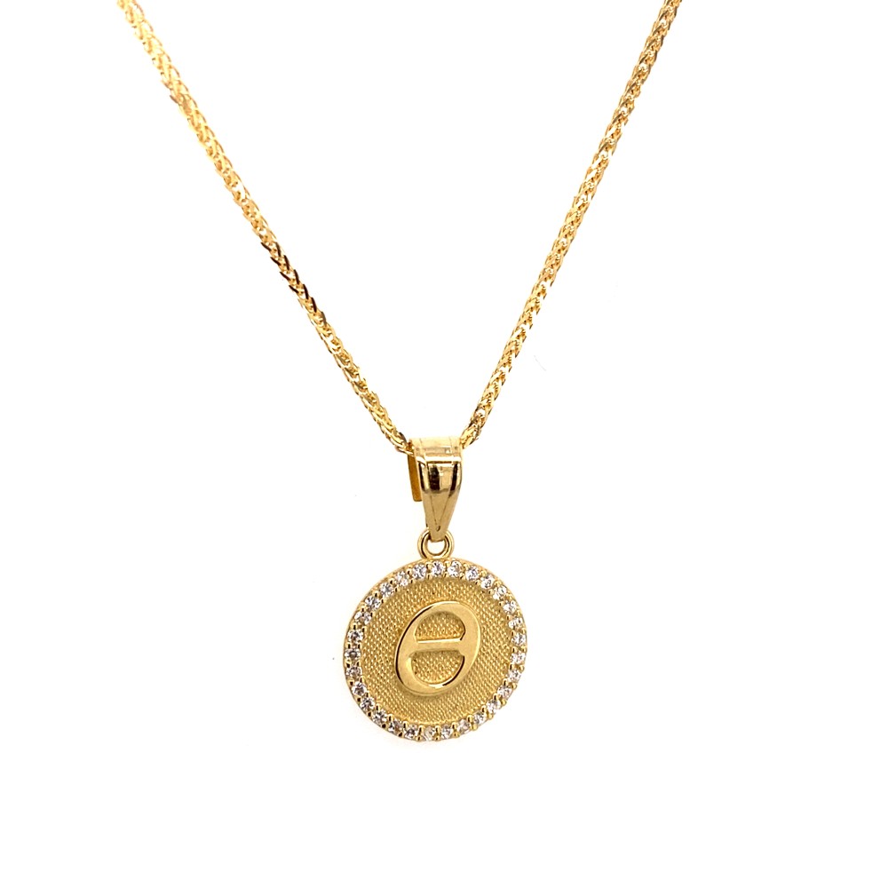 Μονόγραμμα μενταγιόν ''Θ'' σε χρυσό 14Κ με λευκά ζιργκόν περιμετρικά. Τιμή χωρίς αλυσίδα.